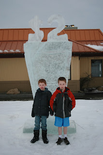 These are some random pictures from the past 2 months. The boys have enjoyed their cross country skiing lessons and Paul and I have enjoyed accompanying them on the trails. In February, we have the Peninsula Winter Games, including ice sculpture contests. We tried to get pictures with a lot of these amazing sculptures. Yes, Hunter is wearing shorts and coat, and it is 35 degrees. Natural lessons are the best learned... all I am going to say about that wonderful boy. Love his drive for learning. Ha Ha!